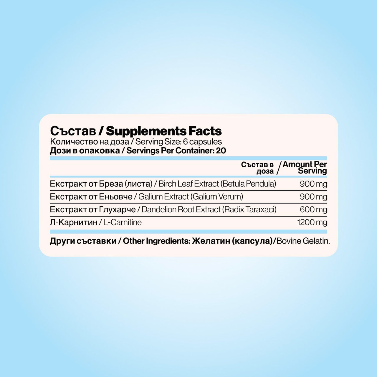 Екстракт от Бреза (листа), екстракт от Еньовче, екстракт от Глухарче, L-карнитин.
