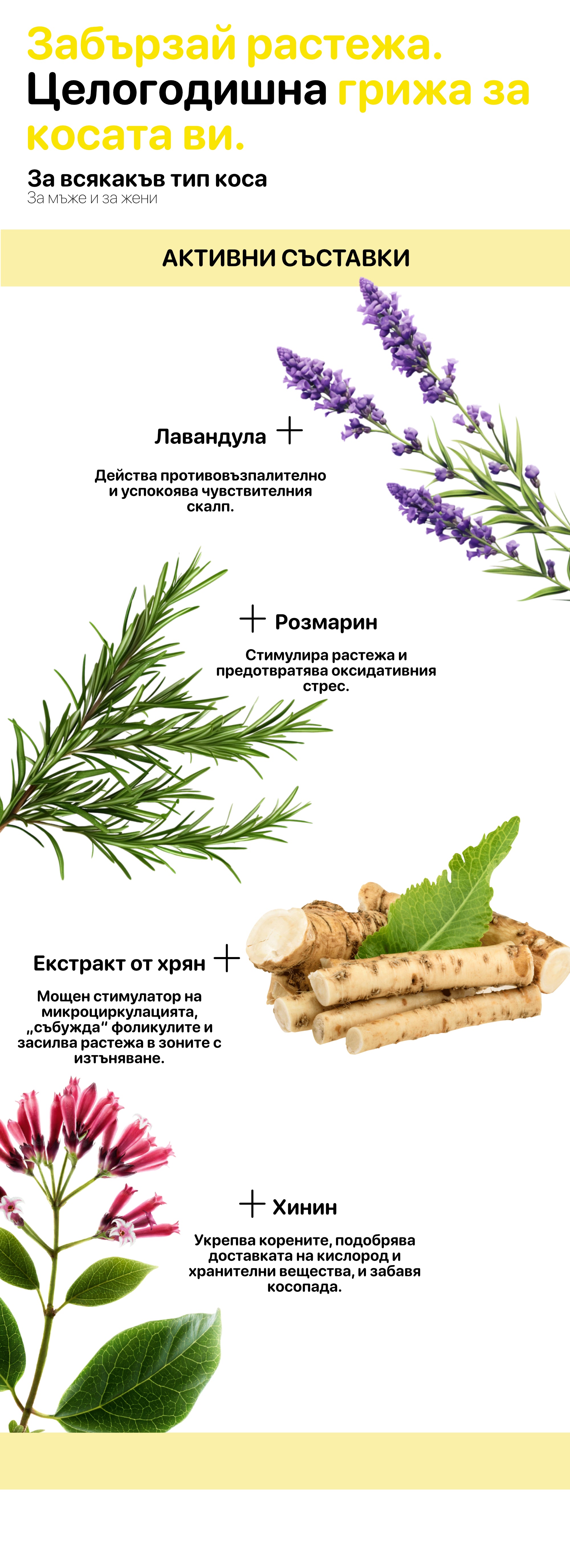 Вода, етанол денат., екстракт от хрян, етерично масло от лавандула, етерично масло от розмарин, хинин.