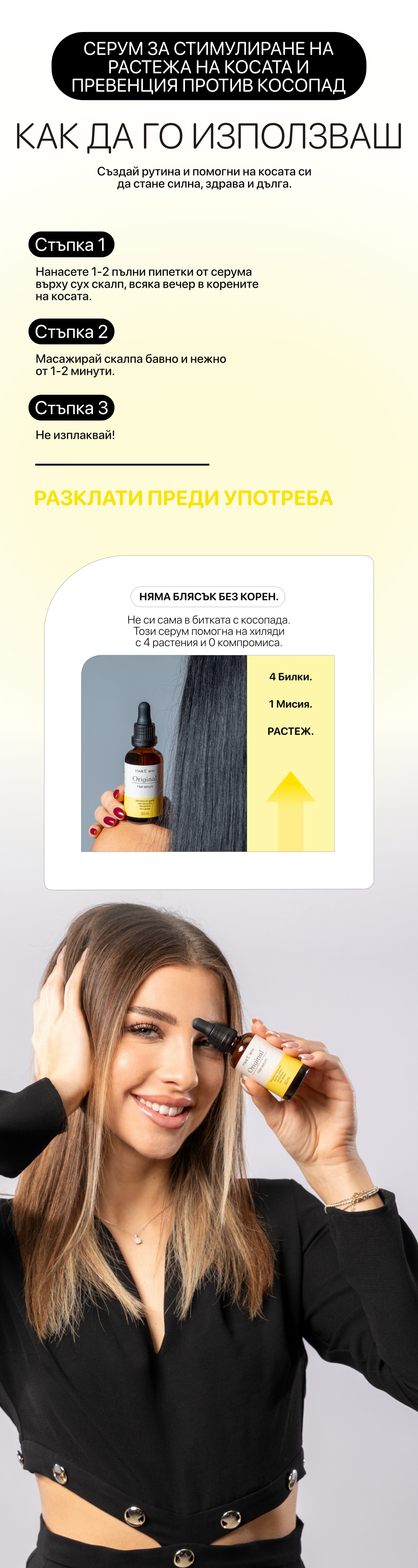 Нанасяйте по 3 пълни пипетки от серума върху сух скалп, всяка вечер в корените на косата. Масажирай скалпа бавно и нежно от 1-2 минути. Без изплакване.