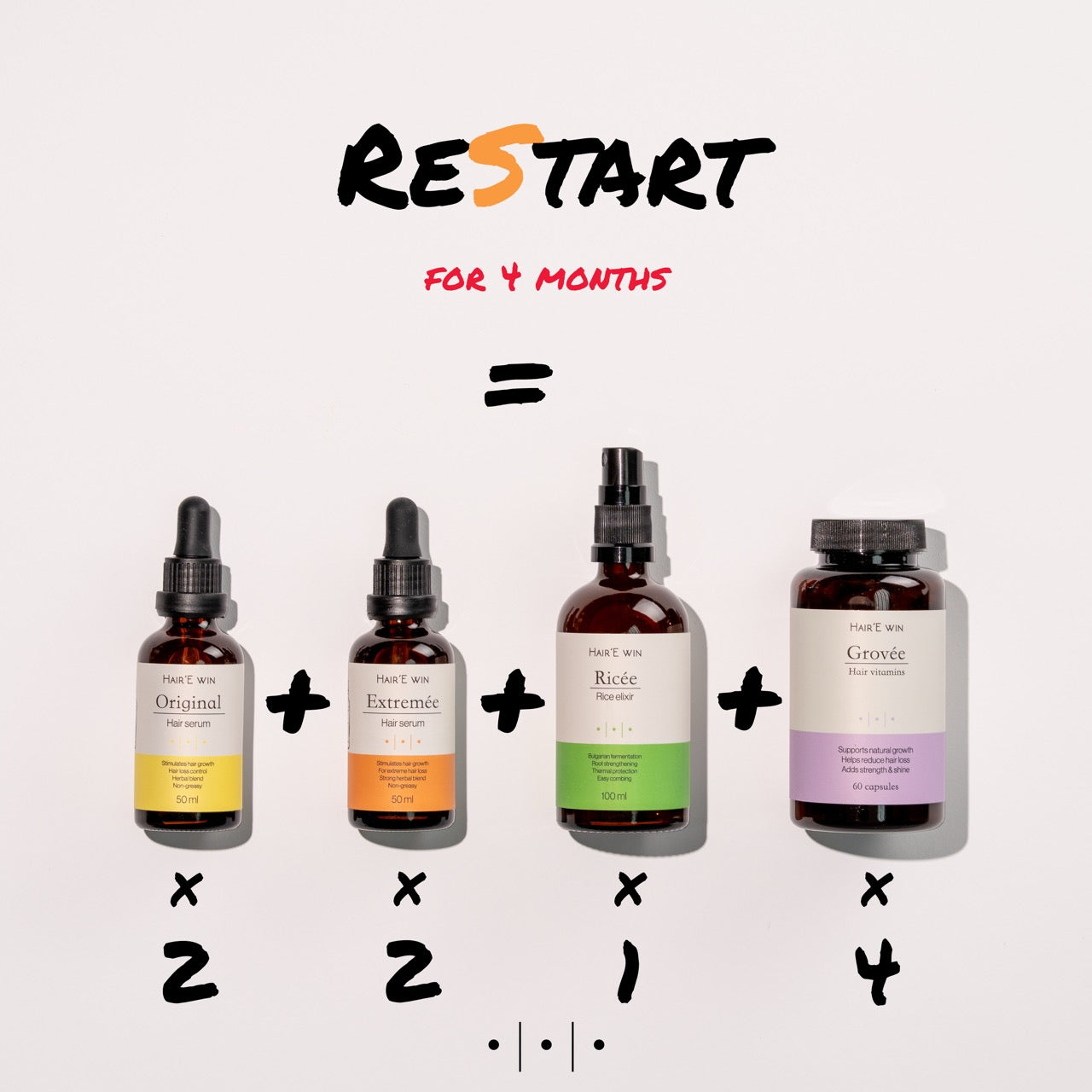 Фаза 3 (Поддържане): Ricée – оризов еликсир Използва се всеки път след измиване, върху влажна коса - поддържа хидратацията, здравия микробиом и жизнеността на скалпа Може да се впръсква само в корените– за растеж и баланс Grovée – витамини за косаЗавършваш пълния 4-месечен курс – по 2 капсули дневноХрани косата отвътре с фолиева киселина, цинк, биотин, коприва и хвощУкрепва косъма, намалява оредяване и накъсване.